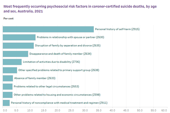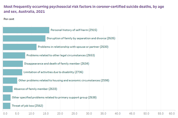 They represent the most frequently occurring psychosocial risk factor in coroner-certified deaths, by age and sex, Australia, 2020, for males and females.